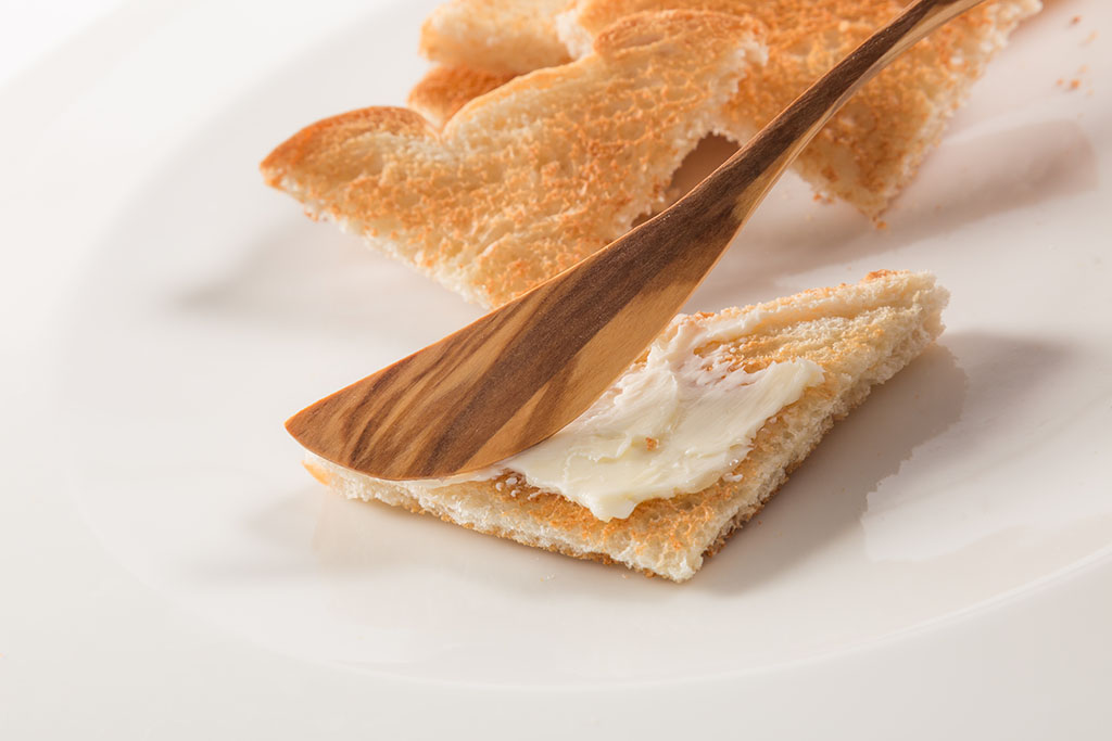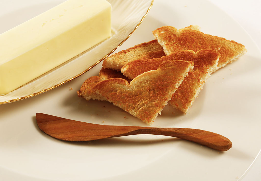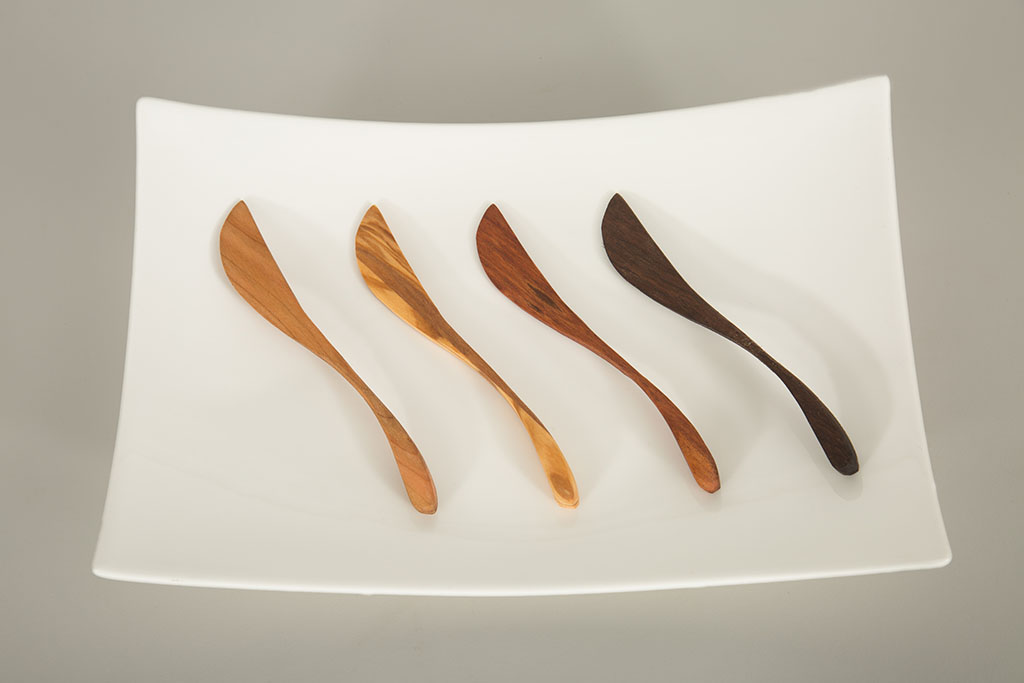 These Butter Spreaders are sanded and shaped by hand.  They can be fashioned out of any species of wood.  Pictured here, they are made from Cherry, Olive Wood, Tiger Wood and Black Walnut